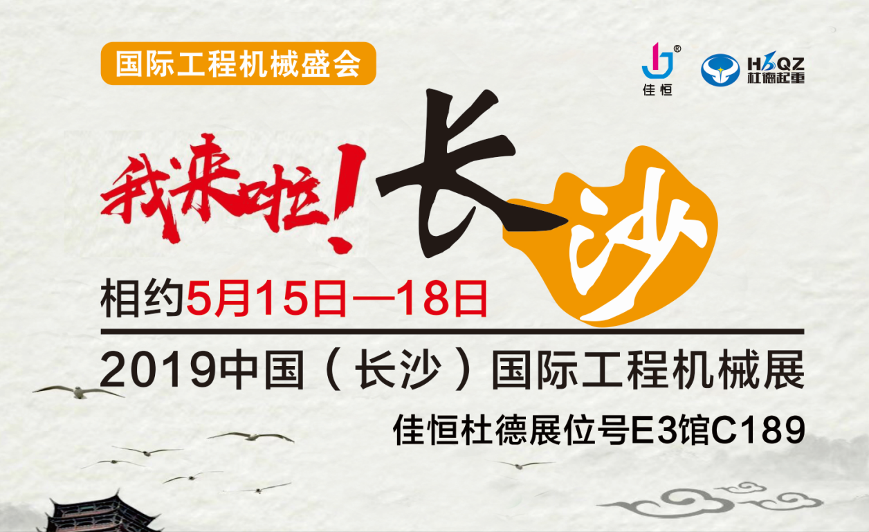 2019中國(長沙)國際工程機械展覽會將于5月15至18日在長沙國際會展中心拉開帷幕。湖北杜德起重機械有限公司展位位于E3館C189號。展會期間歡迎您的光臨,我們將竭誠為您服務!